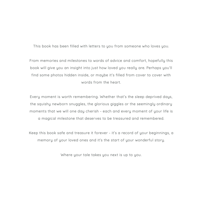 As standard, Letters to You comes as a collection of 30 prompted spaces and 14 blank pages to encourage and inspire you to write from the heart. From letters for every birthday to words of advice for the future, completing Letters to You for your little one will leave them with a collection of heartfelt words to treasure for years to come.